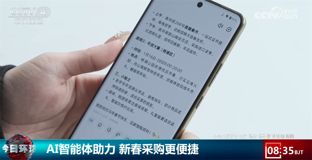 央视网消息:马年春节脚步越来越近,过年的科技味儿也越来越浓,从AI智能体帮着挑年货、规划采购路线,到机器人当导购写福字,再到传统景区用无人机点亮夜空,科技过大年真真切切地融入了我们每个人的生活。接下来,我们就跟着返乡的年轻人,一起去感受AI智能体当年货参谋是怎样的体验。